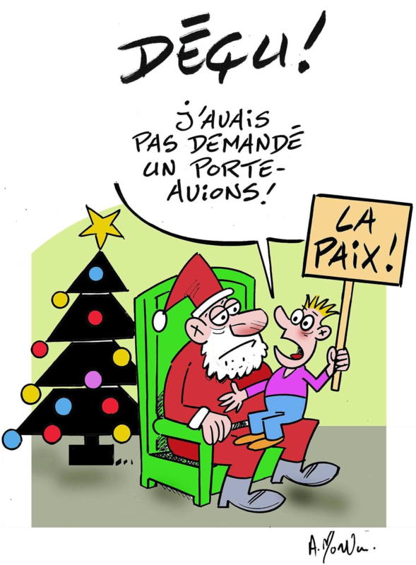 Ce gamin ne voulait pas un porte-avions pour Noël. Il voulait la paix, ce qu’il indique avec une pancarte qu’il tient à la main. Sûr qu’il ne doit pas être d’accord avec les consignes du chef d’état-major qui nous demandait de faire le sacrifice de nos enfants !