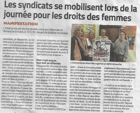 Il présente le programme de l’intersyndicale biterroise pour la journée internationale de lutte pour les droits des femmes.